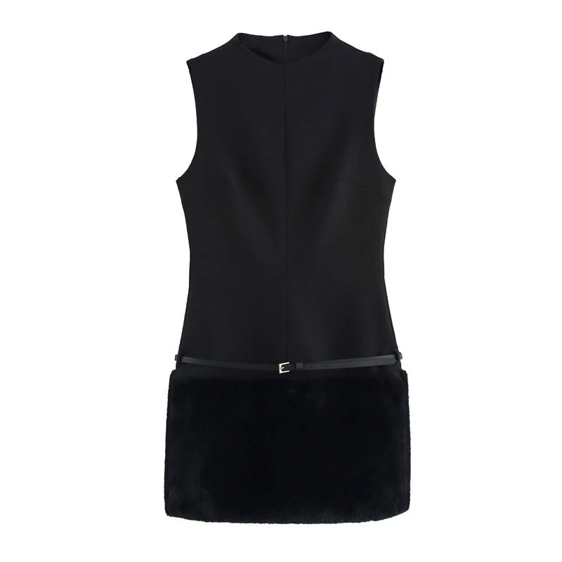 Elegant Black Fur Patchwork Mini Dress – Sleeveless O-Neck with Belt, Slim Fit Party & Evening Dress 2025